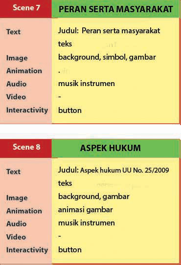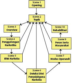 Storyboard menjelaskan gambaran visual setiap scene, sedangkan struktur navigasi menjelaskan hubungan antara scene tersebut